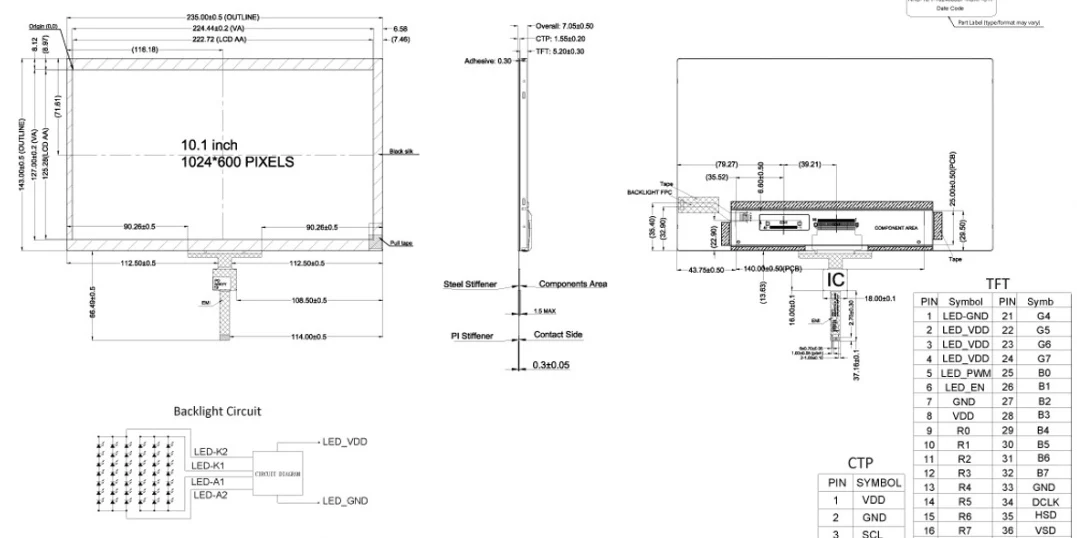 அதன் மெலிதான பரிமாணங்கள் 235mm × 143mm × 7.05mm சிறிய சாதனங்களுக்கு ஏற்றதாக அமைகிறது. 3.3V ஆல் இயக்கப்படுகிறது மற்றும் 40-பின் FFC கேபிளைப் பயன்படுத்தி (CTPக்கு 6-பின் FFC), 10.1 இன்ச் தொழில்துறை PCAP தொடுதிரை தொகுதி -20°C முதல் 70°C வரையிலான வெப்பநிலையில் இயங்குகிறது மற்றும் சேமிப்பு வெப்பநிலை வரம்பு -30°C முதல் 80°C வரை உள்ளது, இது கடுமையான சூழல்களிலும் நம்பகமான செயல்பாட்டை உறுதி செய்கிறது.