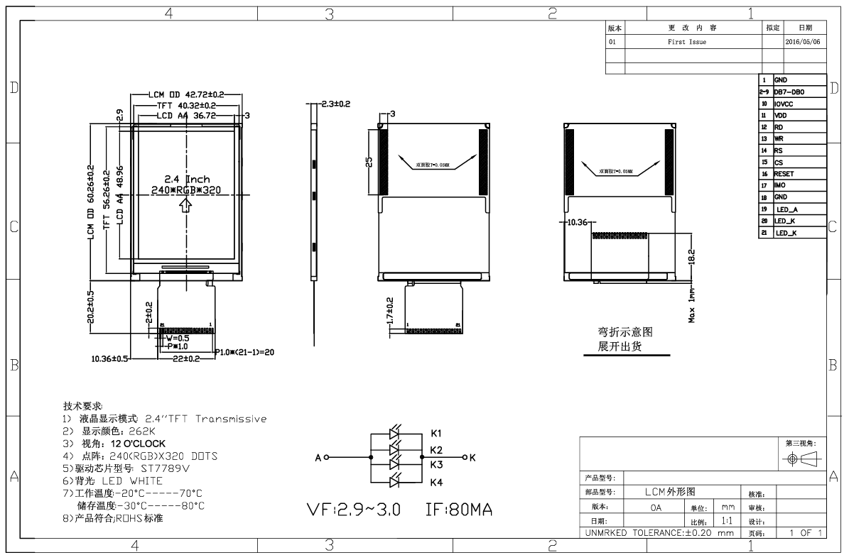 அளவுரு Q2424TC77118A7 (ST7789V டிரைவர் IC உடன் TFT-LCD)