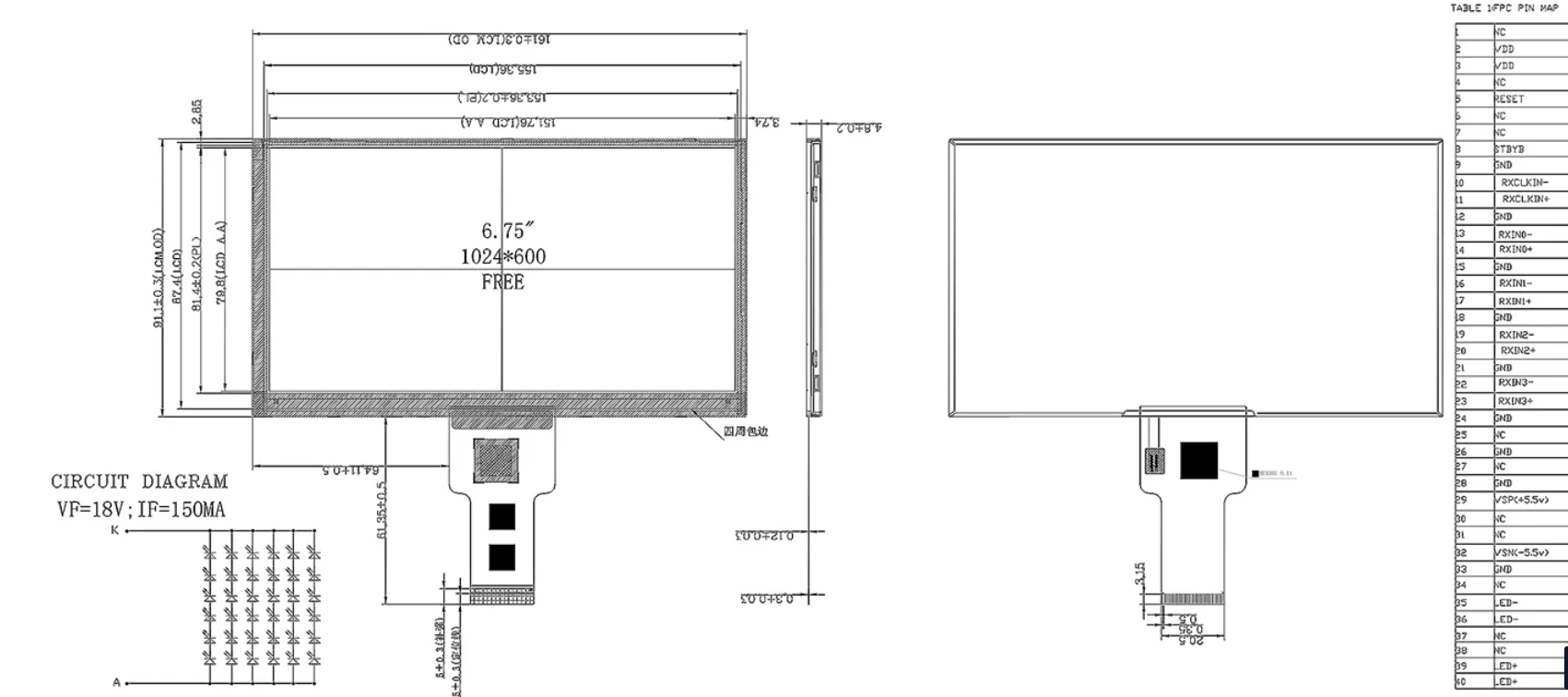 1000 cd/m² பிரகாசம் பிரகாசமான சூழல்களில் கூட சிறந்த செயல்திறனை உறுதி செய்கிறது, அதே நேரத்தில் -30 ° C முதல் +85 ° C வரையிலான இயக்க/சேமிப்பு வெப்பநிலை வரம்பு கடுமையான சூழல்களைத் தாங்குவதை உறுதி செய்கிறது. 161×91.1×4.8 மிமீ (ஆக்டிவ் டிஸ்பிளே பகுதி 151.76×79.8 மிமீ), 6.75 இன்ச் LED பேக்லைட் IPS TFT சிறிய தொடுதிரை தொகுதி LVDS இடைமுகம் மற்றும் 36 LED பேக்லைட்களை எளிதாக ஒருங்கிணைக்கக் கொண்டுள்ளது, இது தொழில்துறை காட்சிகள், வெளிப்புற சூழல் உபகரணங்கள் அல்லது தேவைக்கு ஏற்ற தேர்வாக அமைகிறது.